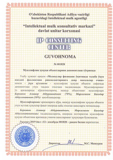 | 8360 | №001828 | Ўқув қўлланма - "Молекуляр физикани ўқитишда талаба ўқув ижодий фаолиятини ривожлантиришга доир масалалар ечиш" | Беркинов Алишер Абдурашидович (70%), Мирсалихов Баходир Абдусаматович (30%) | Беркинов Алишер Абдурашидович, Мирсалихов Баходир Абдусаматович | 12/12/2019 | ![]() |