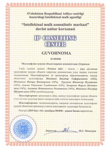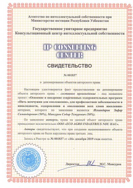 | 8351 | №001837 | Составное произведение - проект: "Освоение и внедрение современных оздоровительных программ "Пять жемчужин для омоложения", для профилактики заболеваемости и инвалидности, оздоровления и омоложения всех слоев населения" | Искандаров Зафар Самандарович (50%), Мансуров Собир Темурович (50%) | OOO "ECO AGRO INDАSTRIUS NOU HAU" | 12/16/2019 | ![]() |