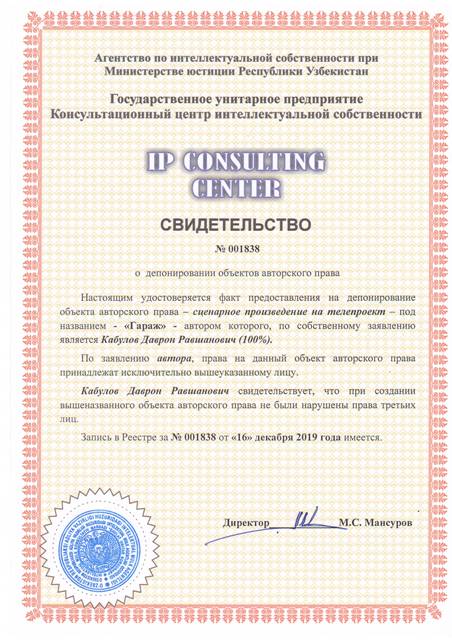 | 8350 | №001838 | Сценарное произведение на телепроект – "Гараж" | Кабулов Даврон Равшанович (100%) | Кабулов Даврон Равшанович | 12/16/2019 | ![]() |