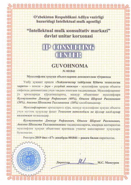 | 8347 | №001841 | Ўқув - услубий мажмуа - "Хайдовчилар тайёрлаш бўйича технологик харита" | Кулмухамедов Джасур Рафикович (40%), Одилов Шерзод Рахмонович (30%), Авазова Шохиста Тиллаваевна (30%) | Кулмухамедов Джасур Рафикович, Одилов Шерзод Рахмонович, Авазова Шохиста Тиллаваевна | 12/17/2019 | ![]() |