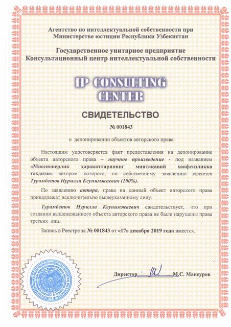 | 8345 | №001843 | Научное произведение - "Миссионерлик ҳаракатларининг минтақавий хавфсизликка таҳдиди" | Турамбетов Нурилла Кеунимжаевич (100%) | Турамбетов Нурилла Кеунимжаевич | 12/17/2019 | ![]() |