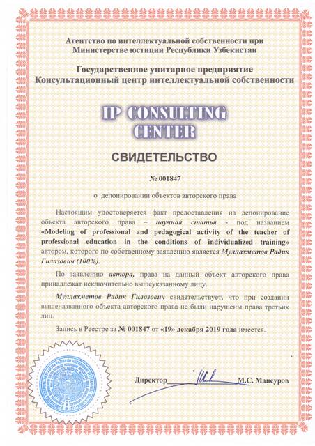 | 8341 | №001847 | Научная статья - "Modeling of professional and pedagogical activity of the teacher of professional education in the conditions of individualized training" | Муллахметов Радик Гилазович (100%) | Муллахметов Радик Гилазович | 12/19/2019 | ![]() |