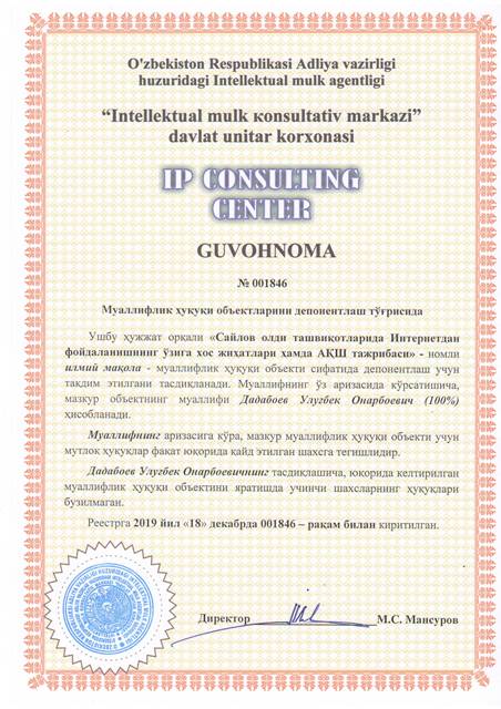 | 8342 | №001846 | Илмий мақола - "Сайлов олди ташвиқотларида Интернетдан фойдаланишнинг ўзига хос жиҳатлари ҳамда АҚШ тажрибаси" | Дадабоев Улуғбек Онарбоевич (100%) | Дадабоев Улуғбек Онарбоевич | 12/18/2019 | ![]() |
