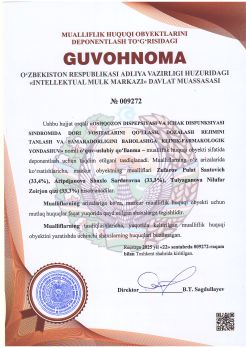 | 834 | №009278 | Ilmiy ishlanma (dissertatsiya) – "ENDOMETRIY DISFUNKSIYАSI BILAN BOGʻLIQ BEPUSHT AYOLLARDA IMPLANTASIYA MARKERLARINING KLINIK-DIAGNOSTIK JIHATLARI" | Jalolova Gavhar Sirojiddin qizi (70%), Shukurov Farxad Ishkulovich (30%) | Jalolova Gavhar Sirojiddin qizi, Shukurov Farxad Ishkulovich | 09/25/2025 | ![]() |