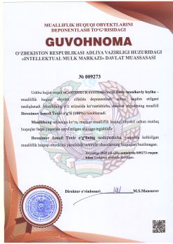 | 839 | №009273 | Ilmiy-texnikaviy loyiha – "CARTOTECH SYSTEM" | Ibroximov Ismoil Toxir o‘g‘li (100%) | Ibroximov Ismoil Toxir o‘g‘li | 09/25/2025 | ![]() |