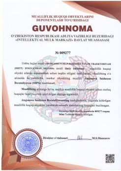 | 835 | №009277 | Ilmiy ishlanma – "MOSLASHUVCHAN-RAQAMLI TA’LIM TRAEKTORIYASI (MRTT) INNOVATSION METODI" | Atajonova Saidaxon Borataliyevna (100%) | Atajonova Saidaxon Borataliyevna | 09/25/2025 | ![]() |