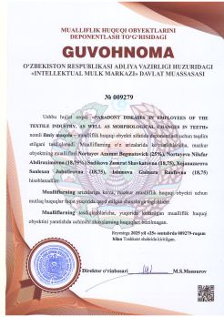 | 833 | №009279 | Ilmiy maqola – "PARADONT DISEASES IN EMPLOYEES OF THE TEXTILE INDUSTRY, AS WELL AS MORPHOLOGICAL CHANGES IN TEETH" | Nortayev Azamat Begmatovich (25%), Nortayeva Nilufar Abdiraximovna (18,75%) Sadikova Zumrat Shavkatovna (18,75), Xojanazarova Saulexan Jubatirovna (18,75), Islamova Gulnara Raufovna (18,75) | Nortayev Azamat Begmatovich, Nortayeva Nilufar Abdiraximovna Sadikova Zumrat Shavkatovna, Xojanazarova Saulexan Jubatirovna, Islamova Gulnara Raufovna | 09/25/2025 | ![]() |