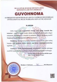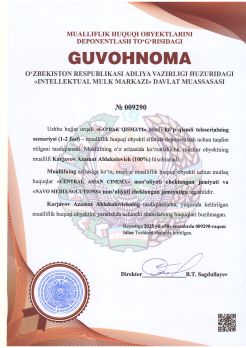 | 822 | №009290 | Ko’p qismli teleserialning ssenariysi (1-2 fasl) – "GO‘DAK QISMATI" | Karjavov Azamat Ablakulovich (100%) | CENTRAL ASIAN CINEMA» mas’uliyati cheklangan jamiyati va «NAVO MEDIA SOLUTIONS» mas’uliyati cheklangan jamiyati | 09/30/2025 | ![]() |
