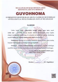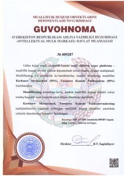 | 825 | №009287 | Elektron o‘quv platforma – "Astro3D-Learn" | Kurbanov Mirzaaxmad (50%), Yusupova Kamola Fozilxonovna (50%) | Kurbanov Mirzaaxmad, Yusupova Kamola Fozilxonovna | 09/29/2025 | ![]() |