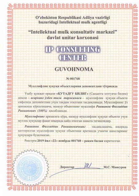 | 8420 | №001768 | Асарнинг ўзбек тили таржимаси - "ҚУТАДҒУ БИЛИГ" (Саодатга элтгувчи билим) | Равшанов Фазлиддин Равшанович (100%) | Равшанов Фазлиддин Равшанович | 11/22/2019 | ![]() |