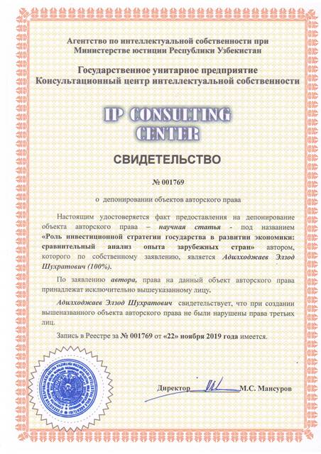 | 8419 | №001769 | Научная статья - "Роль инвестиционной стратегии государства в развитии экономики: сравнительный анализ опыта зарубежных стран" | Адилходжаев Элзод Шухратович (100%) | Адилходжаев Элзод Шухратович | 11/22/2019 | ![]() |