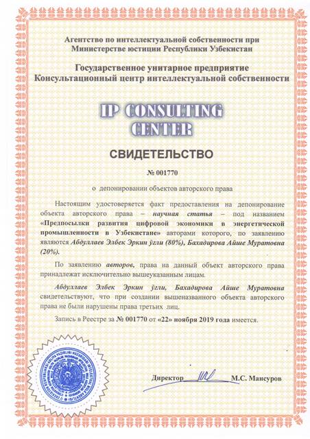 | 8418 | №001770 | Научная статья - "Предпосылки развития цифровой экономики в энергетической промышленности в Узбекистане" | Абдуллаев Элбек Эркин ўғли (80%), Бахадирова Айше Муратовна (20%) | Абдуллаев Элбек Эркин ўғли, Бахадирова Айше Муратовна | 11/22/2019 | ![]() |