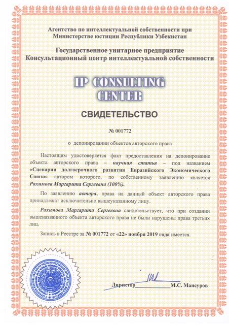 | 8416 | №001772 | Научная статья - "Сценарии долгосрочного развития Евразийского Экономического Союза" | Рахимова Маргарита Сергеевна (100%) | Рахимова Маргарита Сергеевна | 11/22/2019 | ![]() |
