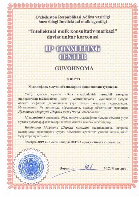| 8415 | №001773 | Илмий мақола - "Dala maydonlarida muqobil energiya manbalaridan foydalanish" | Йўлдошева Мафтуна Шерали қизи (100%) | Йўлдошева Мафтуна Шерали қизи | 11/25/2019 | ![]() |