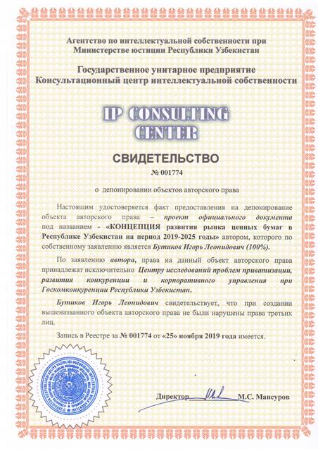 | 8414 | №001774 | Проект официального документа -"КОНЦЕПЦИЯ развития рынка ценных бумаг в Республике Узбекистан на период 2019-2025 годы" | Бутиков Игорь Леонидович (100%) | Центр исследования проблем приватизации, развития конкуренции и корпоративного управления при Госкомконкуренции Республики Узбекистан | 11/25/2019 | ![]() |