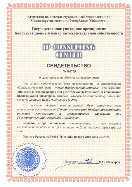 | 8413 | №001775 | Учебно-методический комплекс - "По переподготовке кадров для риэлторской деятельности и повышению квалификации риэлторов" | Бутиков Игорь Леонидович (100%) | Центр исследования проблем приватизации, развития конкуренции и корпоративного управления при Госкомконкуренции Республики Узбекистан | 11/25/2019 | ![]() |
