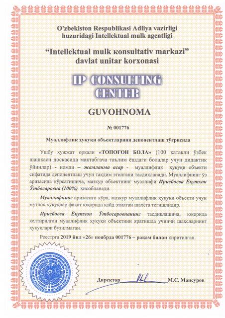 | 8412 | №001776 | Жамланма асар - "ТОПОҒОН БОЛА" (100 катакли ўзбек шашкаси доскасида мактабгача таълим ёшдаги болалар учун дидактик ўйинлар) | Ирисбоева Ёқутхон Ўтбосаровна (100%) | Ирисбоева Ёқутхон Ўтбосаровна | 11/26/2019 | ![]() |