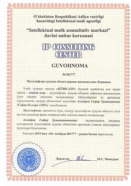| 8411 | №001777 | Адабий асар - "ҚЎШСАТР" (бадиий адабиётда илк жанр) | Аллаёров Сафар Хушвақтович (Сафар Оллоёр) (100%) | Аллаёров Сафар Хушвақтович | 11/26/2019 | ![]() |