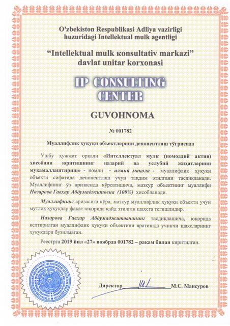 | 8406 | №001782 | Илмий мақола - "Интеллектуал мулк (номоддий актив) ҳисобини юритишнинг назарий ва услубий жиҳатларини мукаммаллаштириш" | Назарова Гавхар Абдумаджитовна (100%) | Назарова Гавхар Абдумаджитовна | 11/27/2019 | ![]() |