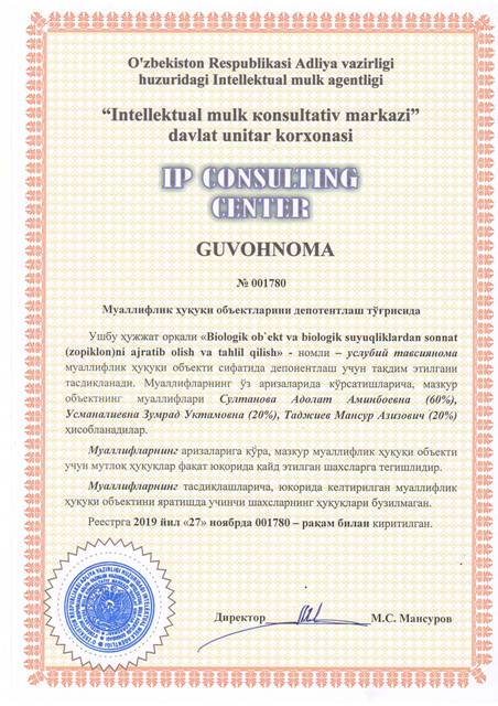 | 8408 | №001780 | Услубий тавсиянома - "Biologik ob`ekt va biologik suyuqliklardan sonnat (zopiklon)ni ajratib olish va tahlil qilish" | Султанова Адолат Аминбоевна (60%), Усманалиевна Зумрад Уктамовна (20%), Таджиев Мансур Азизович (20%) | Султанова Адолат Аминбоевна, Усманалиевна Зумрад Уктамовна, Таджиев Мансур Азизович | 11/27/2019 | ![]() |