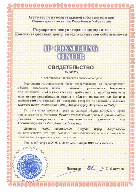 | 8410 | №001778 | Проект официального документа -"Государственные требования к переподготовке и повышению квалификации кадров в области рынка ценных бумаг и корпоративного управления" | Бутиков Игорь Леонидович (50%), Ашуров Зуфар Абдуллоевич (50%) | Центр исследования проблем приватизации, развития конкуренции и корпоративного управления при Госкомконкуренции Республики Узбекистан | 11/27/2019 | ![]() |