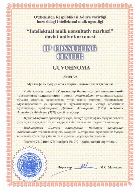 | 8409 | №001779 | Монография - "Ўсимликлар билан заҳарланишларни кимё-токсикологик тадқиқотлари" | Зулфикариева Дилноза Алишеровна (50%), Юлдашев Закирджан Абидович (50%) | Зулфикариева Дилноза Алишеровна, Юлдашев Закирджан Абидович | 11/27/2019 | ![]() |