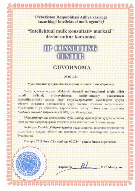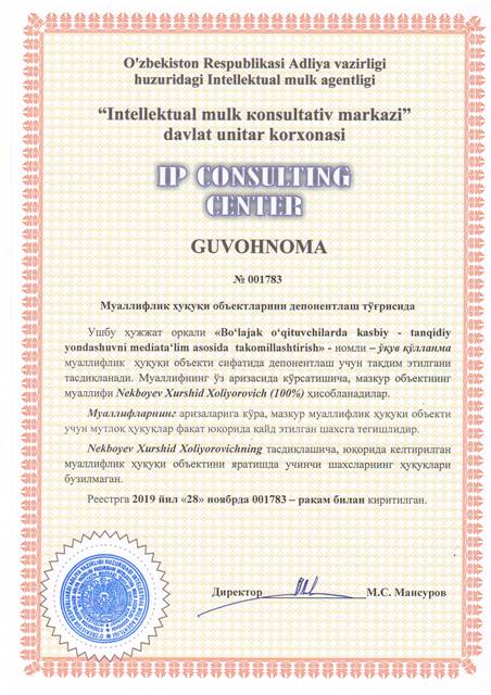 | 8404 | №001784 | Ўқув - услубий қўлланма - "Ikkinchi darajali ma‘lumotlarni talqin qilish orqali bo‘lajak o’qituvchilarga kasbiy-tanqidiy yondashuvni takomillashtirish" | Nekboyev Xurshid Xoliyorovich (100%) | Nekboyev Xurshid Xoliyorovich | 11/28/2019 | ![]() |