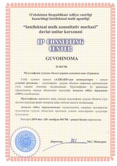 | 8402 | №001786 | Услубий қўлланма - "АЛЖАБР"дан компьютерга | Акмалов Аббос Акрамович (100%) | Акмалов Аббос Акрамович | 11/28/2019 | ![]() |