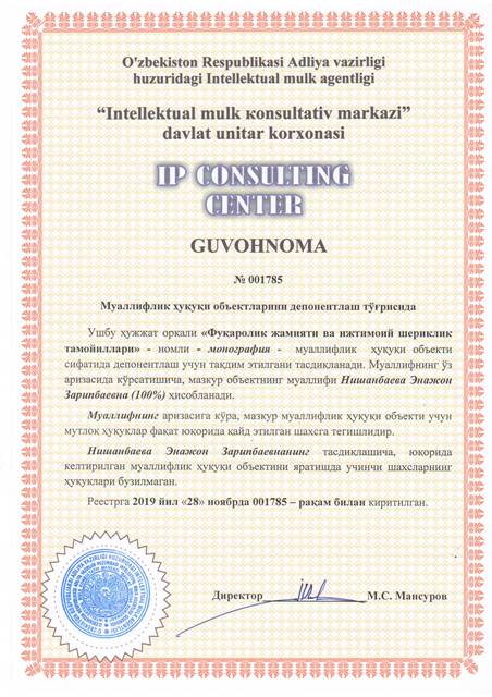 | 8403 | №001785 | Монография - "Фуқаролик жамияти ва ижтимоий шериклик тамойиллари" | Нишанбаева Энажон Зарипбаевна (100%) | Нишанбаева Энажон Зарипбаевна | 11/28/2019 | ![]() |