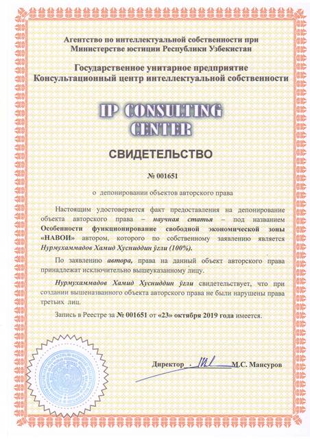 | 8537 | №001651 | Научная статья - "Особенности функционирование свободной экономической зоны "НАВОИ" | Нурмухаммадов Хамид Хусниддин ўғли (100%) | Нурмухаммадов Хамид Хусниддин ўғли | 10/23/2019 | ![]() |