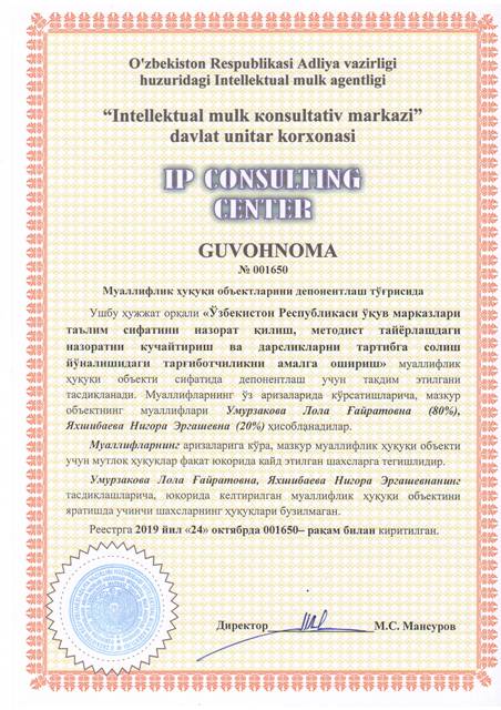| 8538 | №001650 | Составное произведение – "Ўзбекистон Республикаси ўқув марказлари таълим сифатини назорат қилиш, методист тайёрлашдаги назоратни кучайтириш ва дарсликларни тартибга солиш йўналишидаги тарғиботчиликни амалга ошириш"" | Умурзакова Лола Ғайратовна (80%), Яхшибаева Нигора Эргашевна (20%) | Умурзакова Лола Ғайратовна, Яхшибаева Нигора Эргашевна | 10/24/2019 | ![]() |