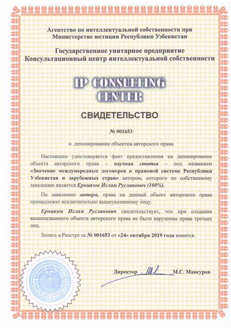 | 8535 | №001653 | Научная статья - "Значение международных договоров в правовой системе Республики Узбекистан и зарубежных стран" | Ерниязов Ислам Русланович (100%) | Ерниязов Ислам Русланович | 10/24/2019 | ![]() |
