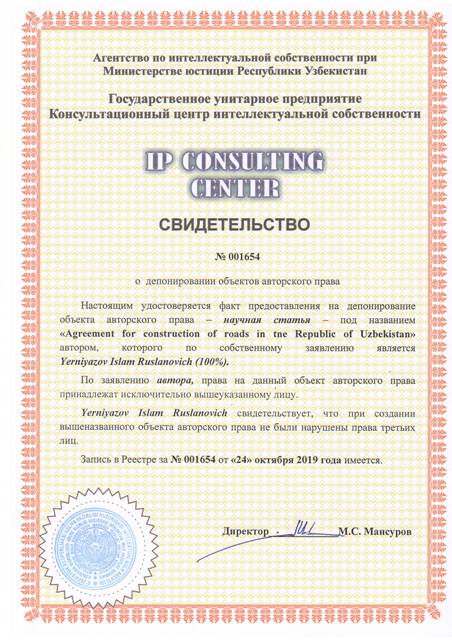 | 8534 | №001654 | Научная статья - "Agreement for construction of roads in tne Republic of Uzbekistan" | Yerniyazov Islam Ruslanovich (100%) | Yerniyazov Islam Ruslanovich | 10/24/2019 | ![]() |