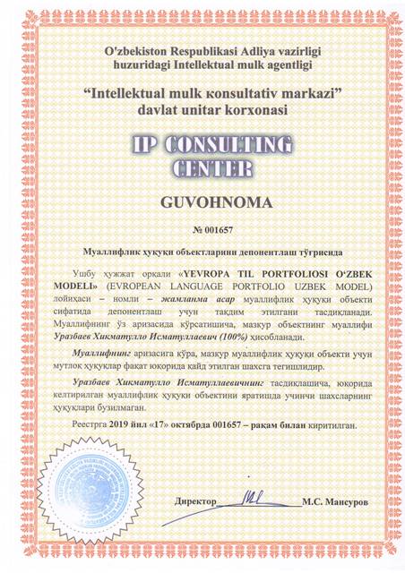 | 8531 | №001657 | Жамланма асар - "YEVROPA TIL PORTFOLIOSI O‘ZBEK MODELI" (EVROPEAN LANGUAGE PORTFOLIO UZBEK MODEL) лойиҳаси | Уразбаев Хикматулло Исматуллаевич (100%) | Уразбаев Хикматулло Исматуллаевич | 10/17/2019 | ![]() |