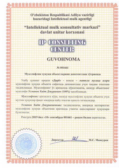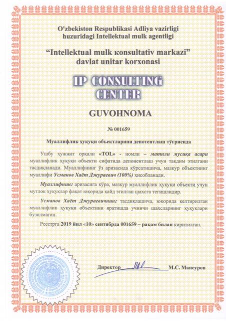| 8529 | №001659 | Матнли мусиқа асари - "TOL" | Усманов Хаёт Джураевич (100%) | Усманов Хаёт Джураевич | 09/10/2019 | ![]() |