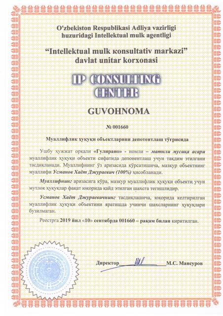 | 8528 | №001660 | Матнли мусиқа асари - "Гулирано" | Усманов Хаёт Джураевич (100%) | Усманов Хаёт Джураевич | 09/10/2019 | ![]() |