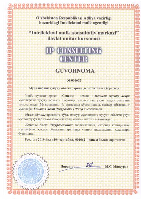 | 8526 | №001662 | Матнли мусиқа асари - "Сенсиз" | Усманов Хаёт Джураевич (100%) | Усманов Хаёт Джураевич | 09/10/2019 | ![]() |