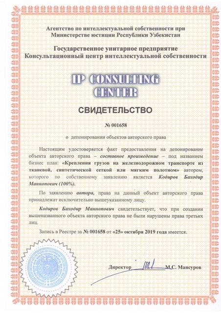 | 8530 | №001658 | Составное произведение – бизнес план: "Крепления грузов на железнодорожном транспорте из тканевой, синтетической сеткой или мягким полотном" | Кодиров Баходир Маннопович (100%) | Кодиров Баходир Маннопович | 10/25/2019 | ![]() |