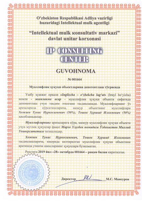 | 8524 | №001664 | Жамланма асар - "Inglizcha – o‘zbekcha lug‘at" (brayl bo‘yicha) | Хожиев Тунис Нуркосимович (50%), Тошов Хуршид Илхомович (50%) | Мирзо Улуғбек номидаги Ўзбекистон Миллий университети | 10/28/2019 | ![]() |