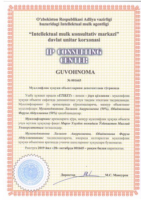 | 8523 | №001665 | Ўқув қўлланма - "ЕTIKET" | Мухамеджанова Лалихон Ашуралиевна (50%), Обиджонова Феруза Абдуллаевна (50%) | Мирзо Улуғбек номидаги Ўзбекистон Миллий университети | 10/28/2019 | ![]() |