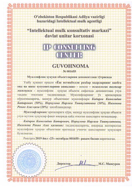 | 8533 | №001655 | Психологик тестлар мажмуаси - "Ёш истиқболли раҳбар кадрларнинг касбга оид ва шахс хусусиятларини аниқлаш бўйича" | Кадиров Камолидин Батирович (50%), Норкулова Наргиза Ташпулатовна (30%), Низомова Раъно Азиз қизи (20%) | Кадиров Камолидин Батирович, Норкулова Наргиза Ташпулатовна, Низомова Раъно Азиз қизи | 10/23/2019 | ![]() |