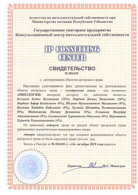 | 8558 | №001630 | Электронная книга – "РИНОЛОГИЯ" | Қосимов Қобил Қосимович (20%), Нарбаев Камил Пазилович (20%), Нарбаев Зафар Камилович (8%), Юсупов Мухаммаджон Маликович (8%), Касимов Хаётбек Кабулович (8%), Хусанов Шоятбек Рустамжонович (8%), Мадаминова Нигора Эргашевна (8%), Усманова Нилуфар Абдуманоповна (8%), Салиахунова Хуршидахон Одиловна (8%), Нурматова Хуршида Хошимжоновна (4%) | Қосимов Қобил Қосимович, Нарбаев Камил Пазилович, Нарбаев Зафар Камилович, Юсупов Мухаммаджон Маликович, Касимов Хаётбек Кабулович, Хусанов Шоятбек Рустамжонович, Мадаминова Нигора Эргашевна, Усманова Нилуфар Абдуманопна | 10/14/2019 | ![]() |