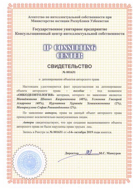 | 8557 | №001631 | Пособие – "ОНКОДЕОНТОЛОГИЯ" | Мамаджанова Шахноз Кахрамоновна (48%), Усмонова Гавхарой Асқаровна (48%), Нурматова Хуршида Хошимжоновна (2%), Мамарасулова София Равшанбековна (2%) | Мамаджанова Шахноз Кахрамоновна, Усмонова Гавхарой Асқаровна, Нурматова Хуршида Хошимжоновна, Мамарасулова София Равшанбековна | 10/14/2019 | ![]() |