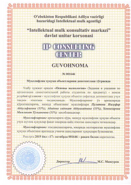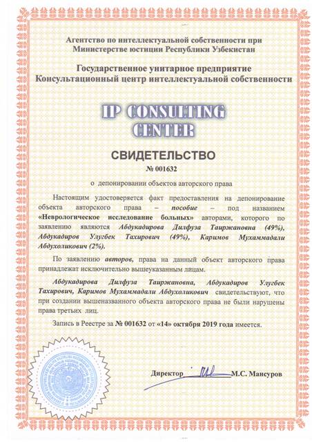 | 8556 | №001632 | Пособие – "Неврологическое исследование больных" | Абдукадирова Дилфуза Таиржановна (49%), Абдукадиров Улугбек Тахирович (49%), Каримов Мухаммадали Абдухоликович (2%) | Абдукадирова Дилфуза Таиржановна, Абдукадиров Улугбек Тахирович, Каримов Мухаммадали Абдухоликович | 10/14/2019 | ![]() |