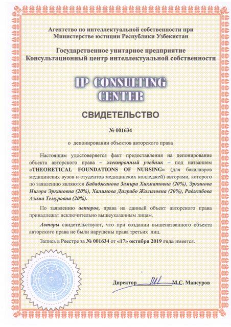 | 8554 | №001634 | Электронный учебник - "THEORETICAL FOUNDATIONS OF NURSING" (для бакалавров медицинских вузов и студентов медицинских колледжей) | Бабаджанова Замира Хикматовна (20%), Эркинова Нигора Эркиновна (20%), Халимова Дилрабо Жалиловна (20%), Раджабова Азима Темуровна (20%) | Бабаджанова Замира Хикматовна, Эркинова Нигора Эркиновна, Халимова Дилрабо Жалиловна, Раджабова Азима Темуровна | 10/17/2019 | ![]() |