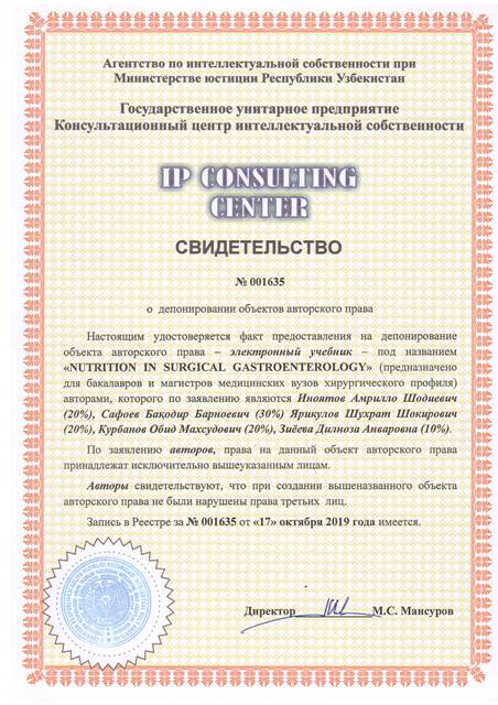 | 8553 | №001635 | Электронный учебник – "NUTRITION IN SURGICAL GASTROENTEROLOGY" (предназначено для бакалавров и магистров медицинских вузов хирургического профиля) | Иноятов Амрилло Шодиевич (20%), Сафоев Бақодир Барноевич (30%) Ярикулов Шухрат Шокирович (20%), Курбанов Обид Махсудович (20%), Зиёева Дилноза Анваровна (10%) | Иноятов Амрилло Шодиевич, Сафоев Бақодир Барноевич Ярикулов Шухрат Шокирович, Курбанов Обид Махсудович, Зиёева Дилноза Анваровна | 10/17/2019 | ![]() |