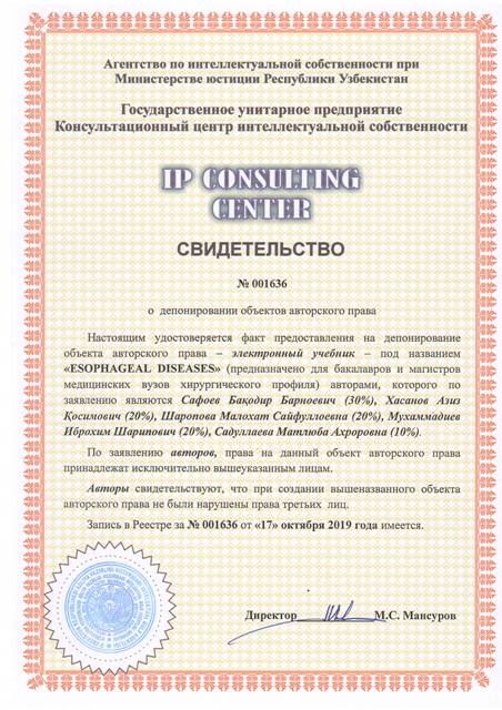 | 8552 | №001636 | Электронный учебник – "ESOPHAGEAL DISEASES" (предназначено для бакалавров и магистров медицинских вузов хирургического профиля) | Сафоев Бақодир Барноевич (30%), Хасанов Азиз Қосимович (20%), Шаропова Малохат Сайфуллоевна (20%), Мухаммадиев Иброхим Шарипович (20%), Садуллаева Матлюба Ахроровна (10%) | Сафоев Бақодир Барноевич, Хасанов Азиз Қосимович, Шаропова Малохат Сайфуллоевна, Мухаммадиев Иброхим Шарипович, Садуллаева Матлюба Ахроровна | 10/17/2019 | ![]() |