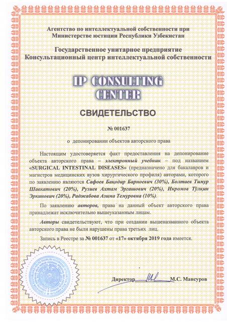 | 8551 | №001637 | Электронный учебник – "SURGICAL INTESTINAL DISEASES" (предназначено для бакалавров и магистров медицинских вузов хирургического профиля) | Сафоев Бақодир Барноевич (30%), Болтаев Тимур Шавкатович (20%), Рузиев Ахтам Эргашович (20%), Икромов Тўлқин Эркинович (20%), Раджабова Азима Темуровна (10%) | Сафоев Бақодир Барноевич, Болтаев Тимур Шавкатович, Рузиев Ахтам Эргашович, Икромов Тўлқин Эркинович, Раджабова Азима Темуровна | 10/17/2019 | ![]() |