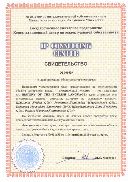 | 8549 | №001639 | Электронный учебник – "A HISTORY OF THE ENGLISH LANGUAGE" (для студентов вуза иностранных языков) | Шадманов Қурбон (20%), Рустамов Дилшодбек Абдувахидович (20%), Баротова Маърифат Баротовна (20%), Шигабутдинова Дина Ясавиевна (20%), Рузиева Махфуза Хикматовна (20%) | Шадманов Қурбон, Рустамов Дилшодбек Абдувахидович, Баротова Маърифат Баротовна, Шигабутдинова Дина Ясавиевна, Рузиева Махфуза Хикматовна | 10/17/2019 | ![]() |