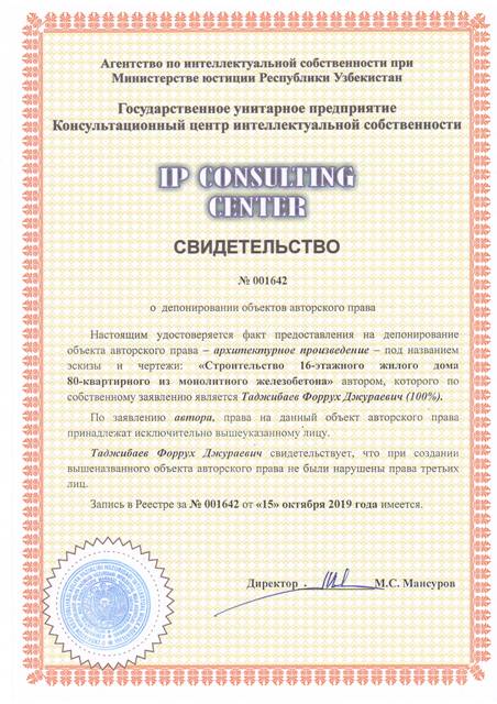 | 8546 | №001642 | Архитектурное произведение – эскизы и чертежи: "Строительство 16-этажного жилого дома 80-квартирного из монолитного железобетона" | Таджибаев Форрух Джураевич (100%) | Таджибаев Форрух Джураевич | 10/15/2019 | ![]() |
